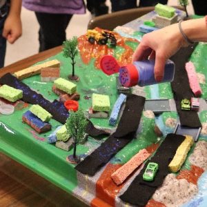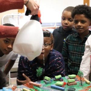 This leads to a discussion about how we can help keep the lake cleaner. Students often suggest not littering and blocking the pollution in some way. For the second “rainstorm,” we scatter a variety of things that represent green infrastructure around the city. Rain gardens, green roofs, rain barrels, and porous pavement all soak up water, slowing down the flow of pollution into Onondaga Lake. This time, students notice that the lake is cleaner after we spray the polluted city.